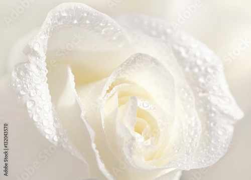 © Laura Pashkevich, Fototapeta premium Beautiful white rose in dew drops close-up macro soft focus spring outdoor on a soft blurred white background. Floral background desktop wallpaper a postcard. Romantic soft gentle artistic image.