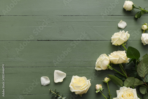 © Pixel-Shot, Naklejka premium Beautiful white roses and eucalyptus branch on green wooden background