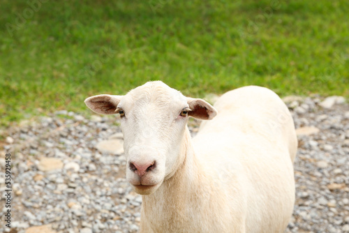 Obraz premium Beautiful white sheep in safari park on summer day