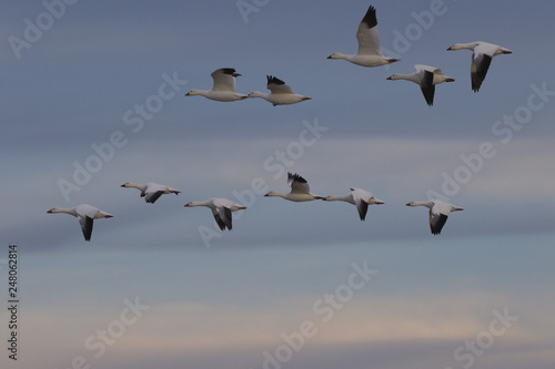 © F&J McGinn, Fototapeta premium Beautiful white snow geese soar across sunset sky
