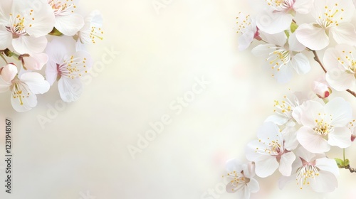 Fototapeta premium Beautiful white spring flowers create a delicate frame on a soft, creamy background, offering ample copy space for text or design elements, evoking a sense of freshness and renewal