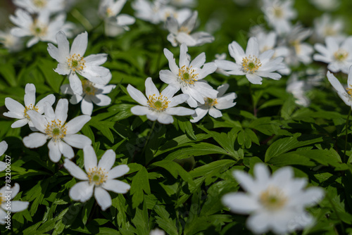 Fototapeta premium Beautiful white spring flowers on green grass