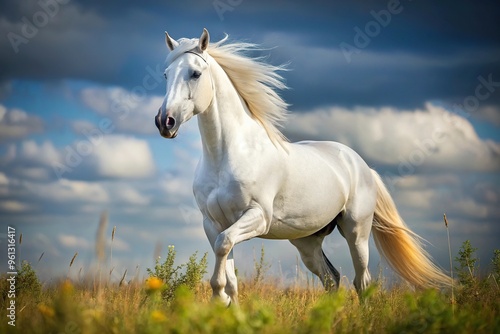 © methinee, Obraz premium Beautiful white stallion seen from a worm's eye view in the wild