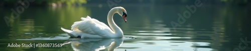 © Chalermrach, Obraz premium Beautiful white swan in still lake with mirrored image, serene, calm