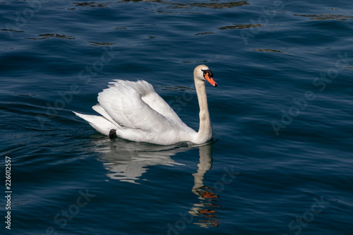 Naklejka premium beautiful white swan swimming calmy in lake lucerne switzerland