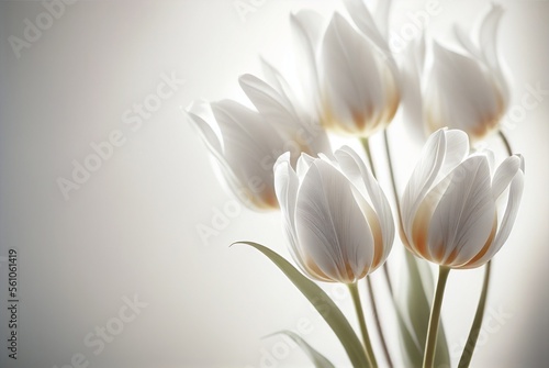 © Nina, Naklejka premium Beautiful white tulips on white background with copy space. White spring flowers. 3D Illustration