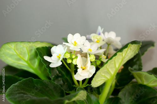 © jineps, Obraz premium Beautiful white violets growing among green leaves. Blooming home plant in the pot with a grey background. Selective focus.