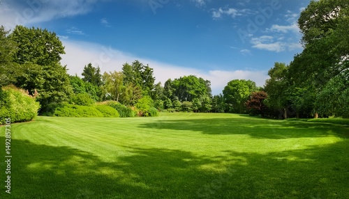 © Lily, Naklejka premium beautiful wide format image of a manicured country lawn surrounded by trees and shrubs on a bright summer day spring summer nature