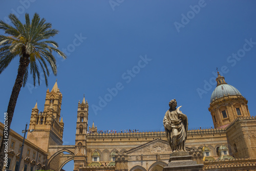 © AlessioDCAuditore, Naklejka premium Beautiful wide view of the historical tourist cathedral of Palermo Sicily, building of Unesco heritage