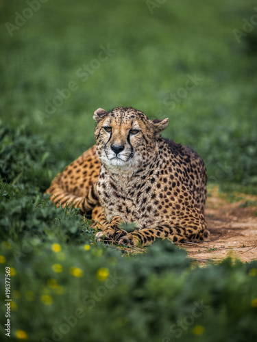 © Artframe , Fototapeta premium Beautiful Wild Cheetah resting on green fields, Close up