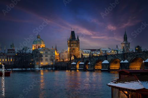 Fototapeta premium Beautiful winter evening view of the illuminated skyline of Prague with Charles Bridge and the snow covered old town roofs, Czezch Republic