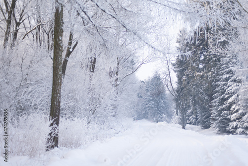 Naklejka premium Beautiful winter forest, forest with trees covered with frost, forest road covered with snow, forest after snowfall