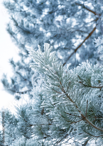 © Ju_see, Naklejka premium beautiful winter forest landscape. Frozen snowy covered pine tree branch close up, abstract nature background. cold frosty weather season. New Year, Christmas holidays atmosphere