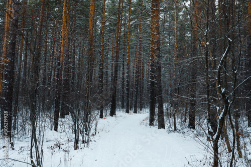© maxandrew, Fototapeta premium Beautiful winter in pine forest. Winter lanscape with heavy snowfall.