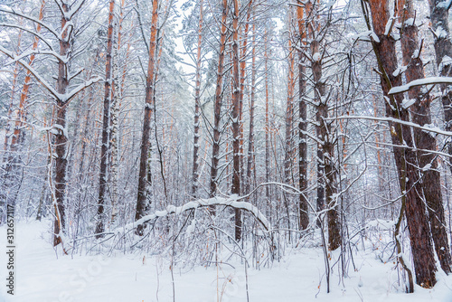 Fototapeta premium Beautiful winter in pine forest. Winter lanscape with heavy snowfall.