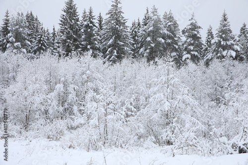 Fototapeta premium Beautiful winter landscape. A row of thickets of young trees and a high forest of fir trees and pines covered with a lot of snow.Image of a snowy woodland on a December day
