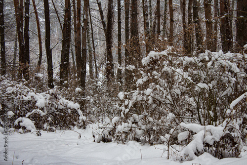 Fototapeta premium Beautiful Winter Landscape Background in a Pine and Deciduous Forest.