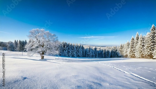 © RR 27, Fototapeta premium Beautiful winter landscape with snow-covered trees and fields under a