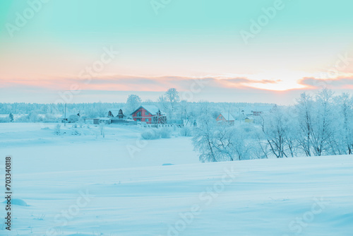 Fototapeta premium Beautiful winter landscape with snow-covered trees and houses.