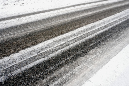 Naklejka premium Beautiful winter landscape with snow-covered trees and road in Latvia.