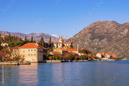Fototapeta premium Beautiful winter Mediterranean landscape. Montenegro, Adriatic Sea. View of Bay of Kotor and Prcanj town