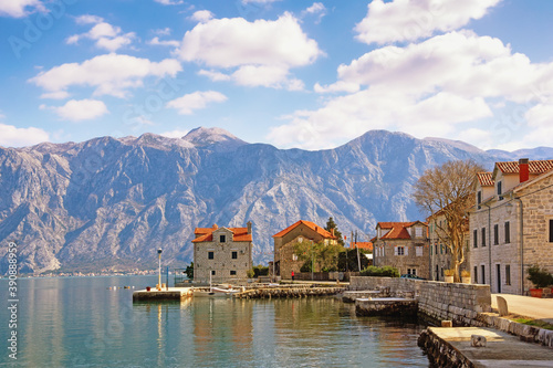 Fototapeta premium Beautiful winter Mediterranean landscape. Montenegro, Adriatic Sea. View of Bay of Kotor and seaside village of Stoliv