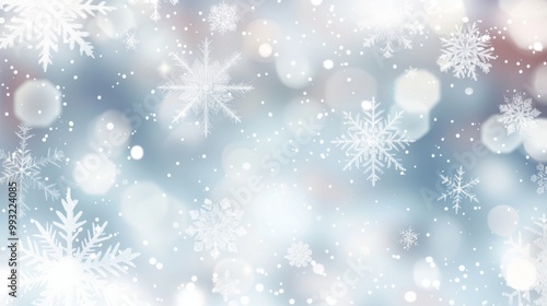 © JINGWEN, Naklejka premium Beautiful winter scene with delicate snowflakes and ice crystals on a light blue bokeh background, perfect for Christmas and seasonal designs, holiday cards, and winter-themed marketing materials.