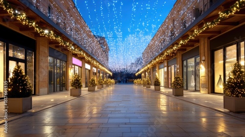 © Matcha_09, Fototapeta premium Beautiful Winter Shopping Street Decorated with Twinkling Lights and Christmas Trees Under a Clear Blue Sky at Dusk