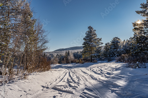 © Erdene, Obraz premium beautiful winter sunny day in the snowy forest in mongolia