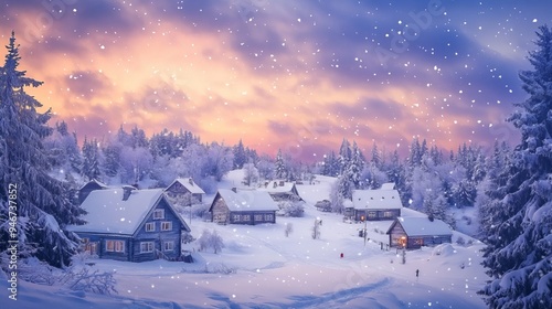 © Olha, Naklejka premium Beautiful Winter Village Under Heavy Snow with Amazing After Sunset Sky