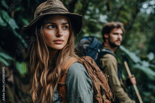 © Di Studio, Fototapeta premium beautiful woman and handsome man hiking in the mountain forest
