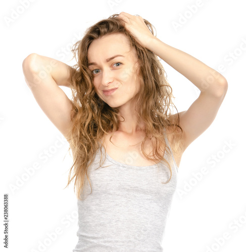 © Kabardins photo, Fototapeta premium Beautiful woman beauty fashion curly wet hair naturalness on white background isolation