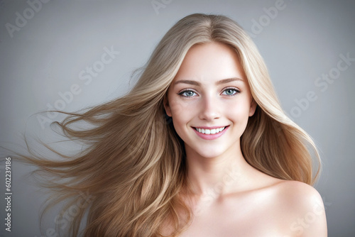 © Anatoly Tiplyashin, Fototapeta premium Beautiful woman blonde beauty close-up portrait on gray background. Generative AI