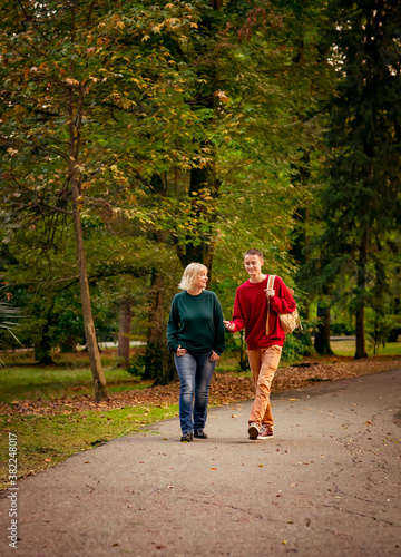 © khanfus, Fototapeta premium Beautiful woman,blonde,middle-aged,with a big son walking in the Park,a beautiful autumn day