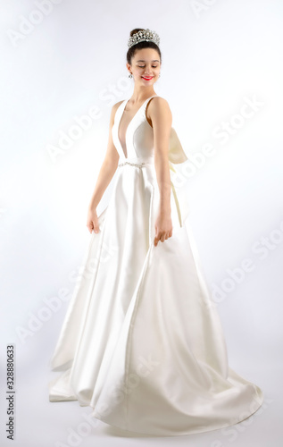 © kravik93, Fototapeta premium Beautiful woman brunette hair perfect skinny body wear fashion long dress for party wedding dress bride natural model with natural makeup style for celebrity and red carpet gray background. Isolated