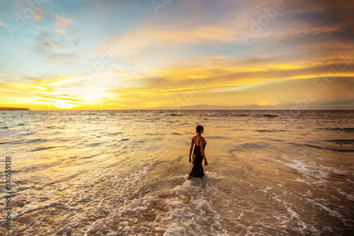 © Maygutyak, Naklejka premium Beautiful woman by the ocean at sunset