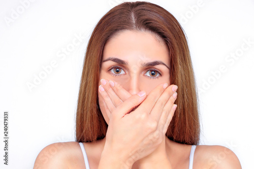 Naklejka premium Beautiful woman closes her mouth with her hands