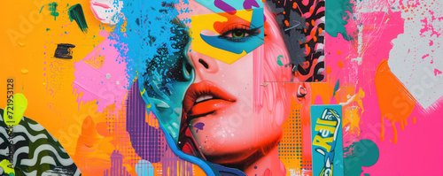© thejokercze, Naklejka premium Beautiful woman, contemporary art collage,modern design work in neon trendy colors