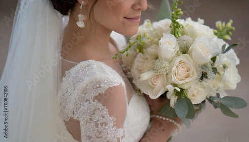 Naklejka premium Beautiful woman dressed as a bride, with a white dress and a bouquet of...