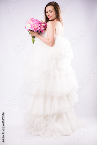 © nagaets, Fototapeta premium Beautiful woman fashion model makeup with blossom peonies.