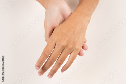 © Teerapong, Obraz premium beautiful woman hands applying moisturizing cream to her skin