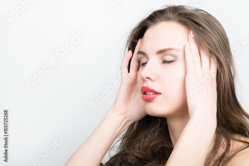 Naklejka premium Beautiful woman holds a head, suffering from a headache. migraine