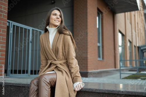 © Andrii , Fototapeta premium Beautiful woman in a brown coat sits in the middle of the street