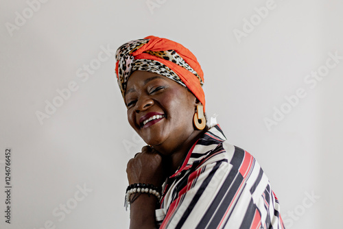 © Cristian, Fototapeta premium Beautiful woman in African clothes happy on a white background. Smiling, serious. Rio de Janeiro, Brazil.