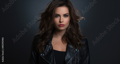 Fototapeta premium Beautiful Woman in Black Leather Jacket Posing with Her Hair