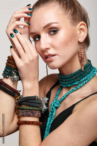 © Serg Zastavkin, Obraz premium Beautiful woman in collar necklace and multiple bracelets.