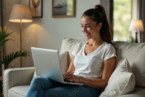 Naklejka premium Beautiful woman in comfortable clothing sits on a couch with an open laptop...