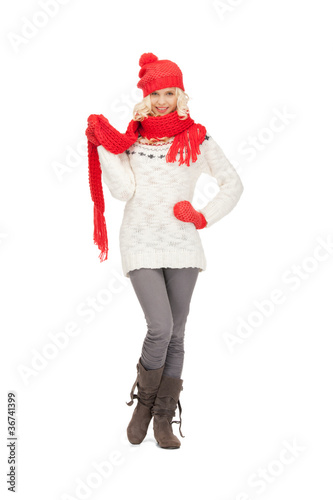 Obraz premium beautiful woman in hat, muffler and mittens