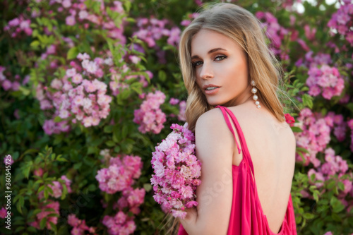 Fototapeta premium Beautiful woman in pink dress and blond long hair collect pink roses. Beauty...