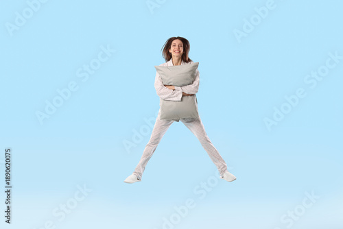 Fototapeta premium Beautiful woman in stylish pajamas with pillow posing on light blue background